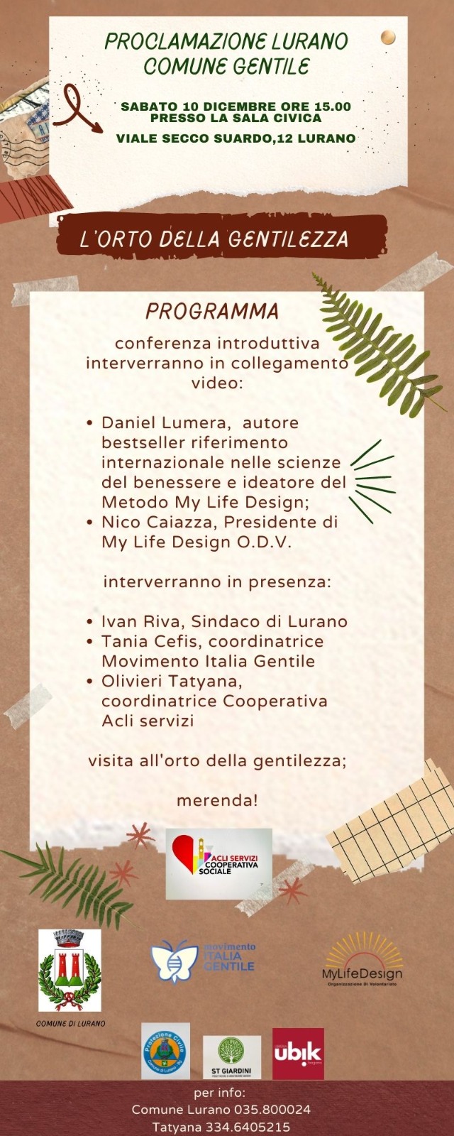 L’idea di recuperare uno spazio municipale trasformandolo in un orto per tutta la cittadinanza, ha fatto sì che il Comune di Lurano verrà proclamato 45° Comune Gentile d’Italia, segno di adesione al Movimento Italia Gentile, un progetto nazionale dell’Associazione My Life Design.