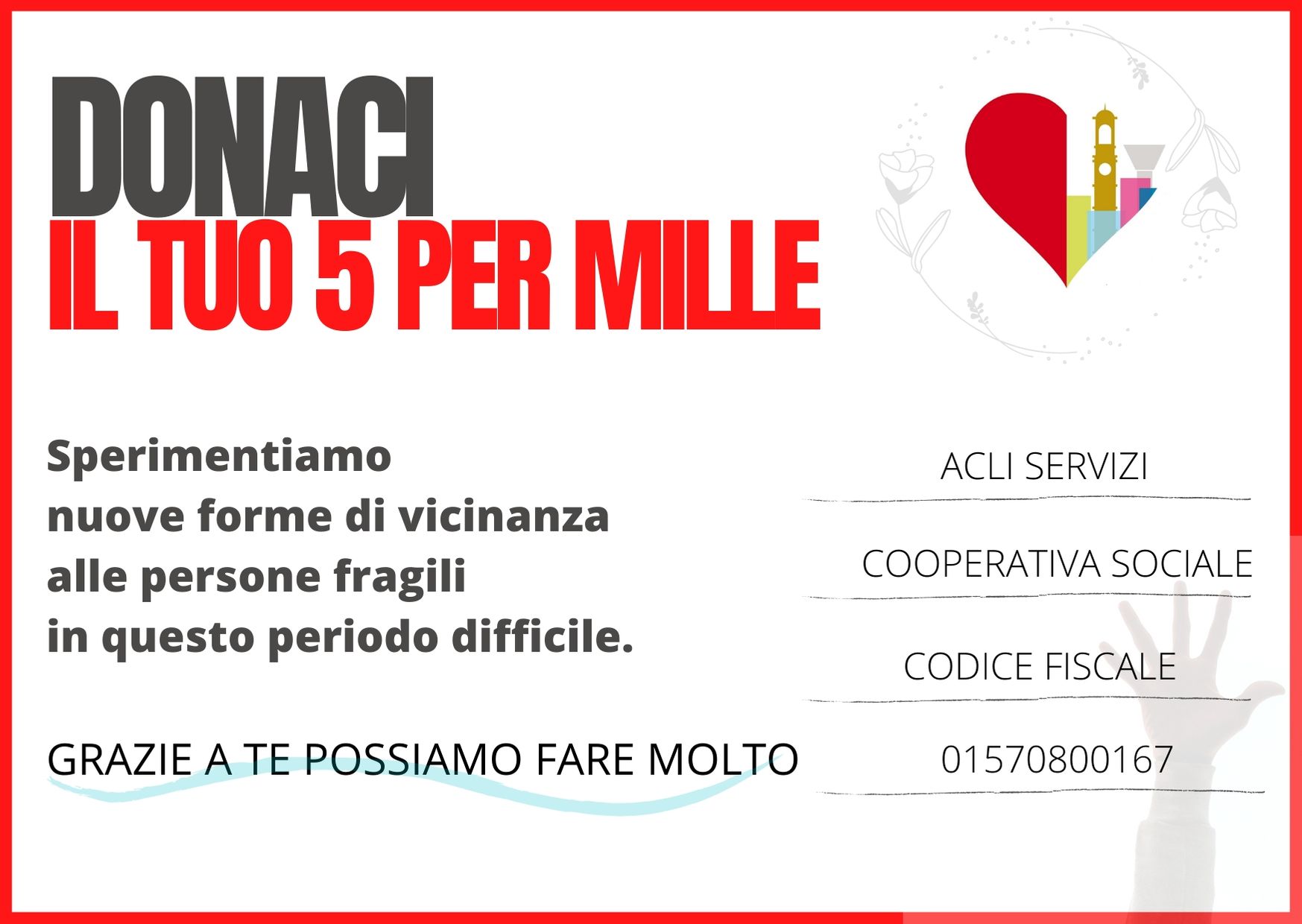 Vuoi darci una mano a sostenere i progetti rivolti a persone con fragilità? Dona il tuo 5 PER MILLE ad ACLI SERVIZI (Codice Fiscale 01570800167).